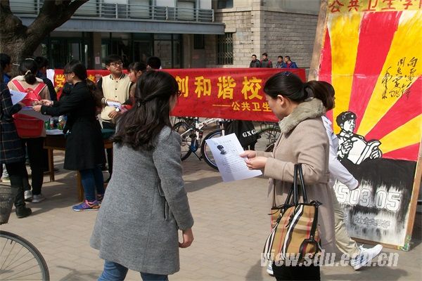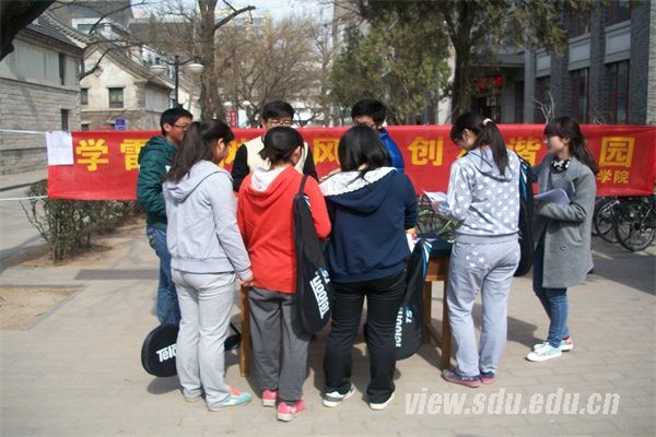 [本站讯]3月5日,由公共卫生学院社会实践部组织的纪念雷锋同志的“学雷锋树新风,创和谐校园”活动在山东大学趵突泉校区的餐厅前举行。