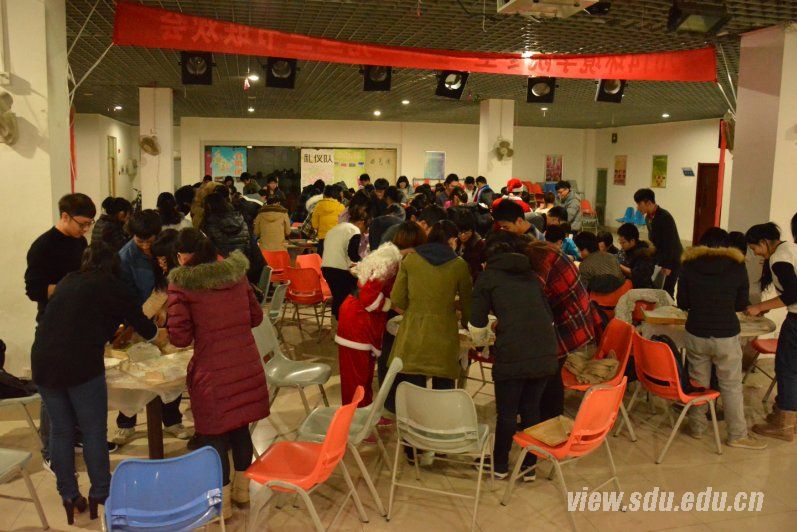 联欢活动的主题为“用饺子填满你的胃,让晚会温暖你的心”。活动开始,首先是同学们自己动手包饺子的环节。同学们根据在场馆入口抽签的结果随机分组,展开包饺子比赛。包饺子比速度,比质量,比花样,各小组齐心合作,斗志昂扬,现场一片热闹欢快。包完饺子后,几位男生扮演饺子快递小哥,将饺子送出煮熟,并负责带回活动现场。与此同时,在吉他弹唱的轻柔音乐声中,元旦歌会拉开帷幕。随后,四个宿舍分别演唱了《匆匆那年》、《Lemon tree》、《Young for you》、《如果的事》,体现出宿舍小家的其乐融融的氛围;环工、环科、资源等三个专业班级也分别展示了各自的班歌,展现出团结友爱的精神;几位同学分别带来的《so sick》、《鞋子特大号》、《The fox》等精彩独唱,将晚会推向了高潮;“饺子大胃王”比赛、“圣诞密码”等趣味游戏穿插在节目中间,更为活动增添了许多欢乐。四位特殊装扮的“圣诞老人”一直活跃在活动现场,他们负责将同学们提前准备好的圣诞礼物送给对应的同学。
