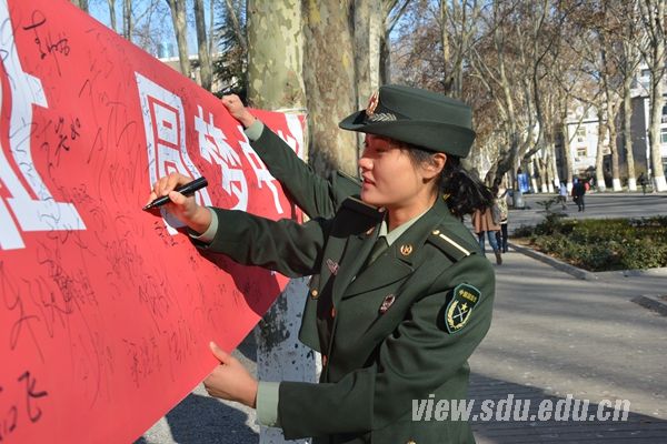上午九时,中心校区国防生在小树林集合完毕。纪念活动前,驻校选培办组织了“勿忘国耻”签名活动。中心校区109名在校国防生依次在写有“勿忘国耻,圆梦中华”和“前事不忘,后事之师”的横幅上庄重地签下了自己的名字。过往的山大师生和附近居民也纷纷自发地在横幅上签名,表达自己不忘国耻,报效国家的拳拳爱国之情。