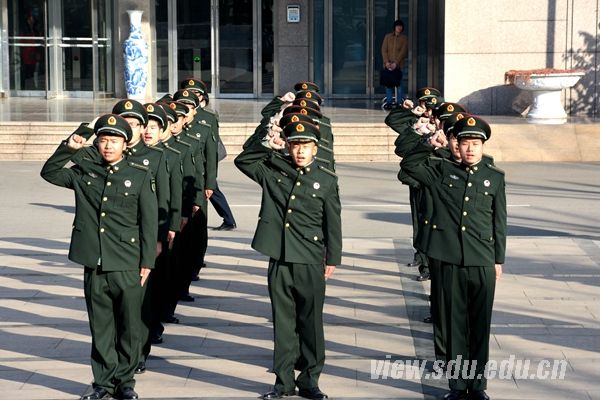上午十时许,纪念活动正式开始。首先进行的是升旗仪式。山大国旗护卫队迈着整齐的步伐护卫着国旗来到升旗台前,国歌响起,在场的办公室领导、国防生和参加仪式的群众齐声高唱《义勇军进行曲》,国歌声久久盘旋。而后,降半旗,为遇难同胞集体默哀一分钟。大家纷纷脱帽,低头默哀,寄托对于遇难同胞的哀思,悲伤之情萦绕整个活动现场。默哀毕,山大国防生模拟三营一连连长郝江聪,带领国防生宣誓,“服从中国共产党的领导,全心全意为人民服务,服从命令,严守纪律,英勇顽强,不怕牺牲,苦练本领,时刻准备战斗,绝不叛离军队,誓死保卫祖国。”誓词字字铿锵有力,宣誓声响彻云霄,表达了所有国防生现身国防事业,立志成为一名符合时代要求和部队需要的合格军人的信心和决心。
