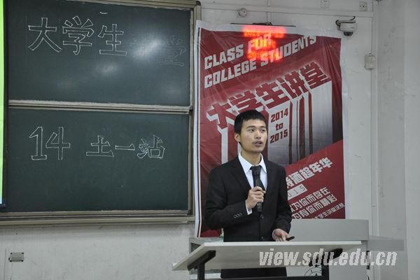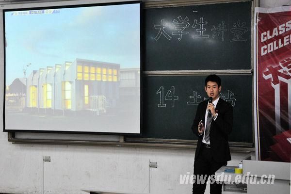 主持人简短的介绍后,六位主讲人便依次开始了他们20分钟的讲堂体验之旅。他们有的以美食为铒,钓出处世与文化的大鱼,“浅谈中华美食”,却带给观众远非浅显的领悟;有的源于生活,自我调侃中闪耀着理性与反思的光芒,一段大学生活,又带来几多思索;有的继古通今,娓娓道来,古今往来间,足显思想的深刻;还有的立足专业,或结合环境热点,辅以震撼人心的短片,直逼人性死角,或由国际领先案例切入,条分缕析,探讨未来专业发展之路。漫画、视频、现场互动,让观众尽享知识的饕餮盛宴。在这样一种轻松的氛围中,大学生讲堂首站告结。