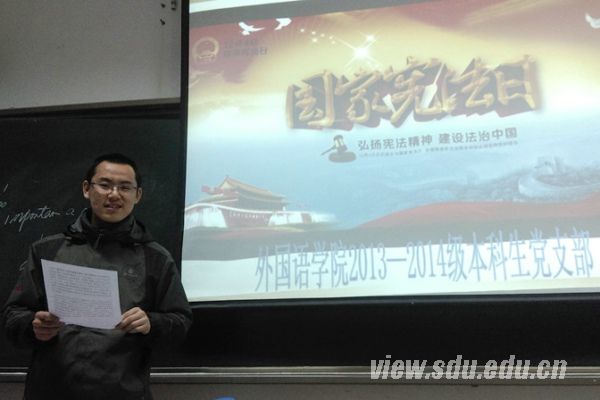 [本站讯]12月4日是我国首个国家宪法日。当晚,外语学院2013、2014级本科生党支部在洪家楼校区举办首届宪法日宣传活动,主题为“弘扬宪法精神,建设法治中国”。