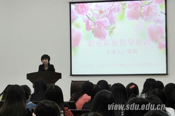 [本站讯]9月25日晚,山东大学2015届毕业生就业指导月活动之职业彩妆培训活动在中心校区举行。本次活动特别邀请到了山东电视台山东新闻联播首席化妆师张明来校为同学们作职场彩妆方面的指导与培训,活动吸引了来自多个校区的近200名应届毕业生的积极参加。