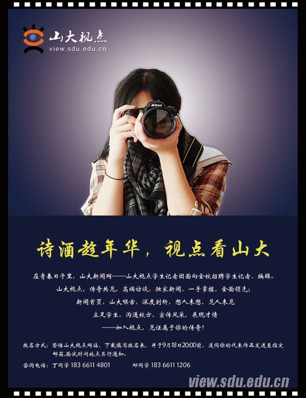 [本站讯]为进一步做好山东大学网络新闻宣传工作,服务学校发展,山大新闻网——山大视点学生记者团现面向全校招聘学生记者、编辑。具体事宜如下: