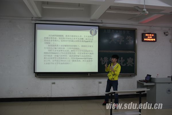 本次比赛共有28位主讲人报名参加。在三天的比赛过程中,他们选取专业方面的知识和自己感兴趣的课题,通过精心准备的ppt和讲稿,生动形象地展示自己的课堂,他们在讲解中融入自己的理解和感悟,使得讲课的内容极具个性色彩。大部分同学讲课的内容为自己感兴趣的话题。其中,来自2012级建筑专业的翟一鸣同学,开堂就向观众抛出了一连串问题,吸引观众的兴趣。他详细地介绍了苏格拉底陷入牢狱之灾的起因、经过,重点讲述了苏格拉底与雅典城邦政治家的辩论内容,配合着自己犀利的语言和夸张的动作,获得在场观众阵阵掌声。作为一名网管会工作人员,来自2013级交通班的于翔为同学们详细介绍了山东大学校园网络的发展过程和未来的发展方向。同时,他与现场同学积极互动,回答了同学们提出的关于校园网网速慢、经常掉线等问题。而来自2011级的张孝健通过自身编辑制作个人网站的经历,利用通俗易懂的语言依次向同学们介绍了如何制作标签,如何进行网页布局。他结合制作软件进行现场演示,使同学们对于网页制作有了更加深入的认识。其他同学有的结合专业,向同学们讲解了建筑材料、建筑结构等方面的内容,有的则是根据校园内占座等现象出现原因进行了深入浅出的分析,还有的同学结合自身经历的事情,与同学们一起探讨了自己的感悟。
