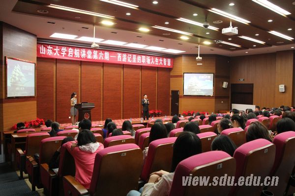 [本站讯]5月10日晚,山东大学“启航讲堂”第六期“西游记里的职场人生大智慧”在中心校区举行。海澜集团总裁助理、战略及人才研究中心总监、海澜商学院院长戴蔚给山大学子作了精彩报告。本期活动由管理学院承办,学生就业与发展指导服务中心主任朱德建、副主任王纪磊,管理学院党委副书记石岩以及来自各学院的300余名山大学子参加了活动。