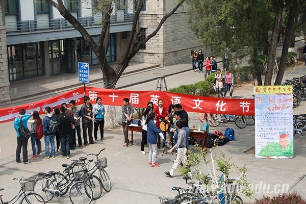 活动开幕式在趵突泉校区食堂门口举行,节目形式丰富多彩:小提琴演奏令人深深陶醉,吉他弹唱使围观的同学们情不自禁地一起哼唱,劲爆的英文歌曲演唱引人驻足,更有各种趣味英语题目激发同学们的求知欲望,回答正确的同学还可以获得精美奖品。在各个节目依次登台的同时,工作人员卖力地对英语文化节进行宣传。