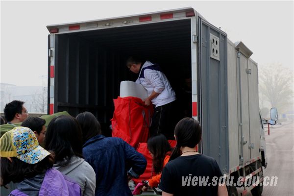 前来送行的同学们也没闲着,纷纷在运送行李的货车旁搭手帮忙,几十个行李在同学们的共同努力下不一会儿就全部装车。