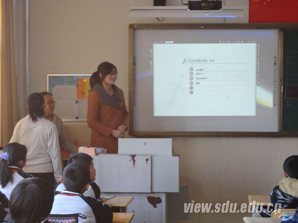 3时15分,志愿者们进入五年级三班教室,课间与同学进行互动,并利用一节班会时间组织活动。在陈主任的主持下,志愿者们逐次介绍自己,队长徐慧通过一段PPT,向同学们介绍山东大学,展示了山大的历史名家、八大校区等内容,其间不断向同学们提出小问题,同学们踊跃回答,得到志愿者们派发的本子等小礼品。接着队员黄迪向同学们展示一段英语口语并教唱英文儿歌《Old Mcdonald had a farm》,同学们积极学习并分声部进行了合唱。约4时,活动顺利结束。