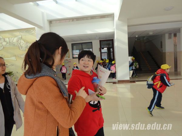 下午2时,志愿者一行8人在趵突泉校区图东教室门口集合,清点所带物品无误后,在队长徐慧的带领下去往济南市汇波小学,经之前培训,乘车、找路线、和学校保安有效沟通等步骤有序进行。3时,志愿者们进入小学,在学生活动主任陈主任的带领下参观汇波小学文化长廊、操场、教学楼。