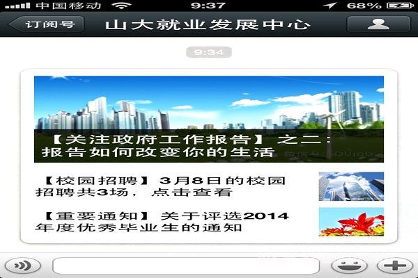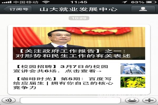 为贯彻落实《教育部关于做好2014年全国普通高等学校毕业生就业工作的通知》和学校新学期工作会议精神,回应师生需求、落实群众路线教育实践活动,就业发展中心于2014年2月25日发布了官方微信,通过移动终端这一渠道及时传递各类优质资源,帮助山大学子更好地开展面向未来、面向世界的职业准备、人格培育、心理保健和社区生活,努力实现更充分和更高质量的就业。上线以来,微信平台除了发布日常各类招聘信息,还关注学生的长远发展,策划了《咖啡时光》等栏目,用大学生喜闻乐见的形式,对其成长成才进行关怀和引导。平台的高品质得到了师生的广泛认可和好评,关注数迅速突破3500人,发挥了良好的传播效益。
