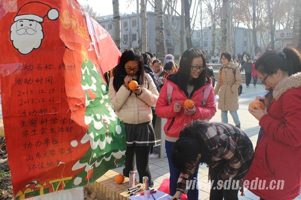 [本站讯]12月19日及22日中午,由生命学院与山东大学环保协会共同举办的“橙意圣诞”活动于中心校区举行。适逢圣诞节前夕,也是水果贺卡等物品消费的高峰期,此次活动旨在通过橙子传递祝福、传递环保与健康生活的理念,为全校师生提供节日的装点。