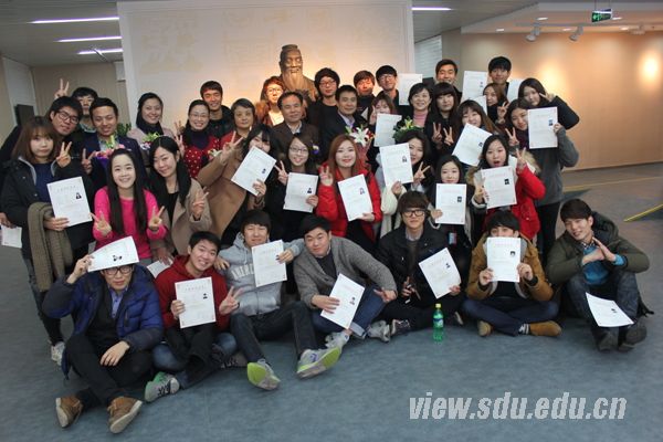 学院汉语教学部老师李昊天在致辞中回顾了一年来同学们在汉语学习和专业课学习中取得的好成绩,希望学分班同学回国后可以给家人朋友介绍中国的社会、经济、文化,学有所成,学以致用,成为中韩文化交流的友好使者。嘉泉大学学生代表黄贤贞在发言中向一直关心和帮助同学们的学校老师表示深深的感谢,表示回国后一定要继续努力学习汉语,以后还会到山东大学来。随后,徐关众、刘明利等领导老师为同学们颁发结业证书。国际教育学院教师代表、有关行政办公室主任及嘉泉大学长期学分班全体同学参加结业典礼。