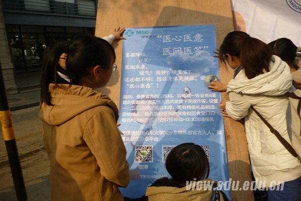 [本站讯]12月2、3日,山东大学默沙东俱乐部分别在软件园校区和趵突泉校区举行了为期两天的“医心医意,医问医答”宣传活动,在会长赵显及各部长的指导下,干事们展开宣传并与同学积极互动,活动顺利进行,并取得了良好效果。