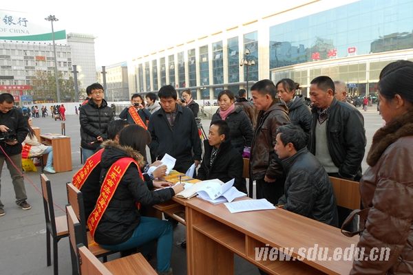 [本站讯]12月4日上午,山东大学学生法律援助中心联合山东省农民工维权工作站和山东财经政法大学、山东师范大学、山东建筑工程学院、济南大学等多所高校在济南火车站广场举办了法制宣传活动。