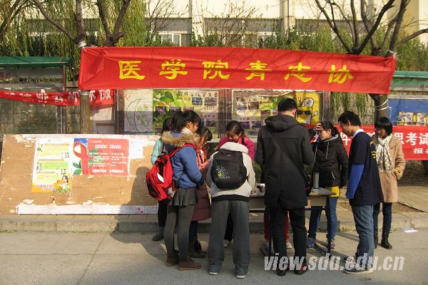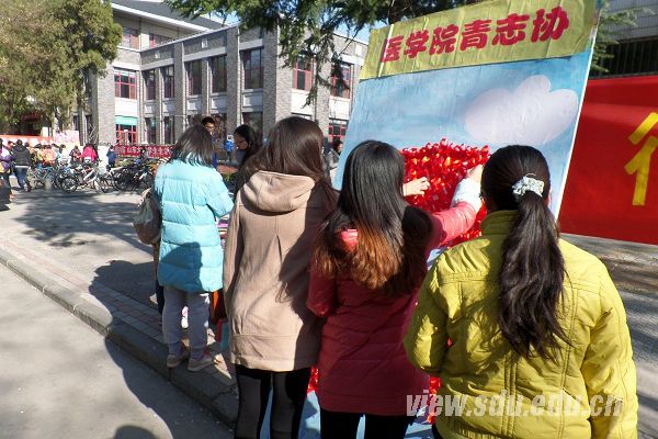 11月30日,红丝带制作及宣传活动于山大软件园校区展开。青志协工作人员通过向行人发放宣传单,介绍世界艾滋病日的由来及活动开展的目的,希望能普及艾滋病知识,消除对艾滋病人的歧视;发放调查问卷,调查大学生的身心健康状况及对艾滋病的认知。同时,鼓励行人参与“红丝带传情”活动,即在工作人员提供的红丝带上写下对艾滋病人的寄语,然后将红丝带系于树上,表达对艾滋病人的祝福。