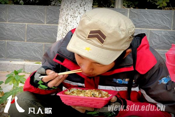 视线转向另一边,另一个快递员已送完大部分快件。在短暂的等待时间,快递员就近买了一份盒饭作为午餐,坐在路边快速解决“战斗”。“我们的饭点都不固定,啥时候不忙,啥时候就抓紧时间吃点。”记者通过谈话了解到,这位快递员尚在实习期间,并没有交通和伙食补助。在快递员吃饭时,陆续有同学前来领快件,他马上放下手中饭盒,着手工作。这顿简易午餐吃了半小时,饭早已凉透。