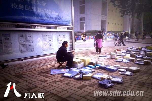 上午,距离与同学们约定的取件时间还有一段时间。快递员就早早赶到约定地点,将快件一件件小心细致地从快递车上搬出,摆放好,静待它们主人的到来。据快递员介绍,今天中午一共有二十几件快递,有网购的时装鞋子,也有电器,还有从家乡寄来的特产和棉被。