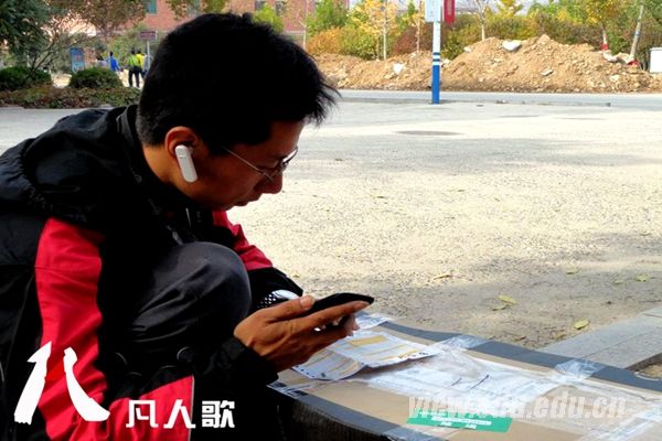快递员一边摆放快递的同时,一边要按照快递单上的联系方式向收件人发送短信通知,有时一上午甚至要发几百条短信。这位快递员大爷正用自己并不流利的手机拼音输入法为快件的主人们发送短信。