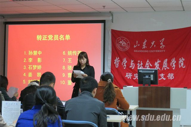 10名即将转正的预备党员与支部全体正式党员参加了此次会议。会议开始,10名预备党员依次汇报了自己在预备期的表现,并宣读转正申请书,向组织提出申请。他们谈到了自己对党的认识,汇报了自己在预备期的表现,向党组织表达了自己转正的迫切心情。宣读完毕后,在场的同学对各位预备党员在预备期的表现进行了评议。经过民主表决,孙慧中、李影、石梦娇等十名预备党员均全票通过,被转为中国共产党正式党员。他们纷纷向党表态,要坚定地跟着党的步伐,为党的事业奉献终身,做一名合格的共产党员。最后,王亚雯对大会进行了总结,并对处于毕业阶段的党员提出了几点期望,她谈到,毕业生党员应该自身调整心态、发挥榜样作用,为同学排忧解难的同时,不断提高自身党性修养,为走上工作岗位奠定基础。