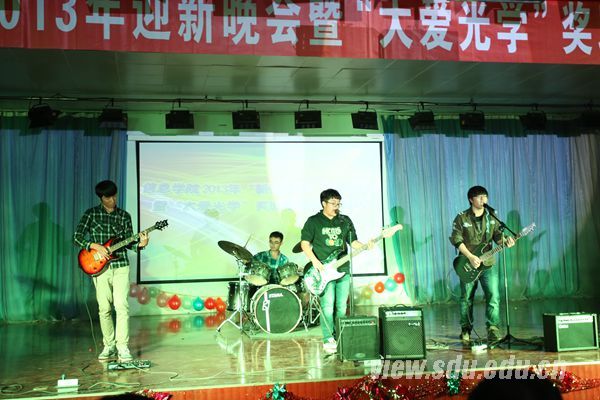 迎新晚会在山东大学摇滚山大H.I.T乐队激情四射的摇滚风表演中拉开帷幕,点燃了观众热情。王卿璞代表学院领导发言,他首先向2013级新生的到来表示欢迎。王卿璞指出,大学生代表着青春、活力、激情、未来和希望。同学们来自五湖四海,为了共同的目标相聚在此,大家应珍惜这种弥足珍贵的友情。此外,王卿璞对新生寄予殷切希望:第一,希望大家努力学习,全面发展;第二,希望大家在大学期间严于律己,宽以待人,创造小的和大的和谐环境。晚会上同时进行了“大爱光学”奖助学金颁奖仪式。山东大学光学系79级校友、齐鲁证券李涛和省公安厅闫雷为获奖学生代表颁奖。李涛还代表山大光学系79级全体校友表达了对母校培育之恩的感谢,同时对新生寄予厚望,希望新生把握好机会,发挥特长,毕业后也能回报母校,回报社会。