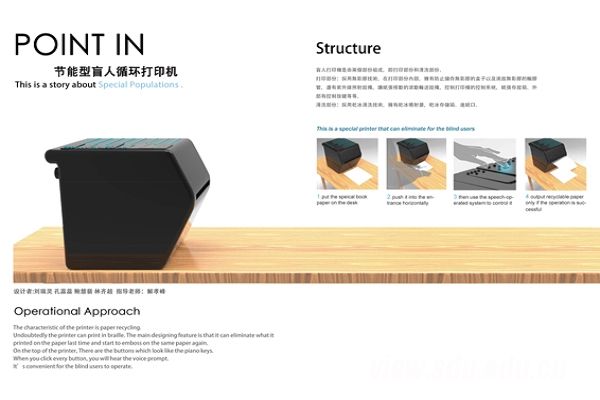 大赛分为艺术设计类、大赛主题设计类、书画摄影类3个单元,紧紧围绕“厉行勤俭节约,反对铺张浪费”这一主题,鼓励大学生通过原创作品的形式,深刻领会并宣传勤俭节约的重大意义。山大获奖作品“POINT IN节能型盲人循环打印机”是一款新概念打印机的设计方案,它与普通打印机最大的不同在于不仅可以帮助盲人解决打印问题,而且还可以完成消除打印痕迹的工作,能够完美实现盲文纸“打印—消除打印—再打印”的循环利用;另一件获奖海报设计作品“无车日,减少资源浪费”则用线条勾勒出迷宫图案,同时显现出“水资源浪费”、“木材资源浪费”、“汽车尾气污染”等字样以及醒目的坟墓图形,警示人们如果不解决浪费和污染的问题,“每一条路都会让人类走向灭亡”。