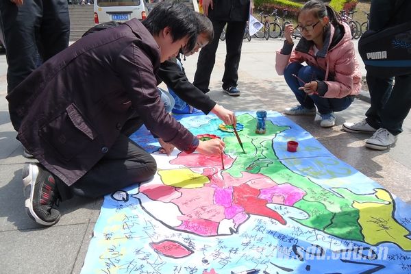活动前,志愿者们佩戴青志协绶带,进行紧锣密鼓的展台布置工作。活动中,志愿者们开始向过路的同学分发宣传单,向他们介绍世界地球日的发展历史与作用意义,并引导同学们到宣传海报上签字。过往同学对志愿者们展示的全国PH2.5地区分布图表现出了极大的兴趣,纷纷驻足查看询问,并在自己家乡对应的地区板块上签字,表明自己爱护环境、抵制污染的信心与决心。许多同学也亲身参与了海报中中国各省份板块的颜色填涂工作,对中国环境污染现状有了更为深刻的认识和了解。与此同时,同学们自发地在留言板上写下了对四川省雅安市地震受灾人民的鼓励和对重建家园的期盼,一句句发自肺腑的话语令在场志愿者为之动容。中午12时30分,活动圆满落下帷幕。电气学院学工部主任、12级辅导员任娃老师,团委书记、10级辅导员魏鲁鸿老师和11级辅导员邱瑶老师指导与支持了本次活动。