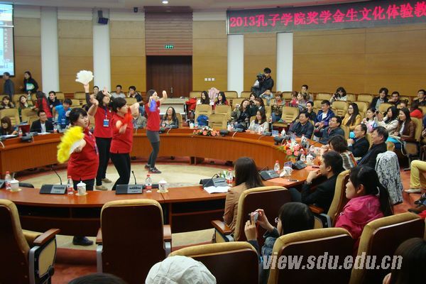 接下来的两天内,同学们参加了由中国传媒大学承办的“做中学”(Learn by doing)——教学观摩与实践课,参观了中国传媒大学特色的文化产业,体验了传媒大学明星课程——汉语正音课,选修了现场采访与点评、民族舞蹈、方言文化和小品模演等八门培训课程。在山东大学带队老师的精心指导下,同学们活学活用,在14日下午的文化体验活动总结会上,和其他院校的同学们共同献上了一场精彩纷呈的汇报表演。蒙古学生哈伦娜表演的绕口令、韩国学生申娜来的民族舞蹈获得阵阵掌声。此次活动中,同学们与其他院校汉语国际教育硕士专业的同学们交流学习心得,有效提高了对汉语教学知识的理解。同学们在此次活动中受益匪浅,更加坚定了日后从事汉语教师职业的决心。