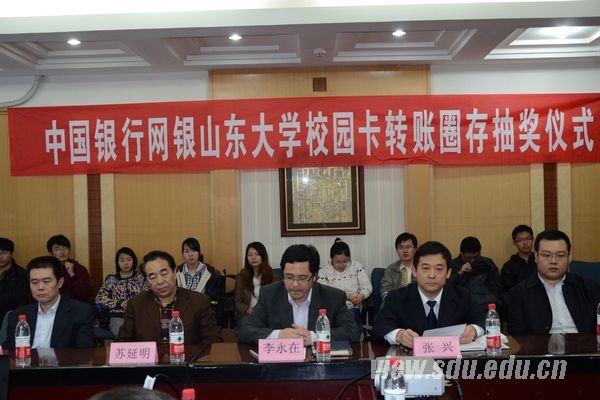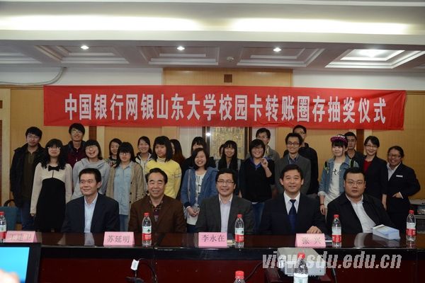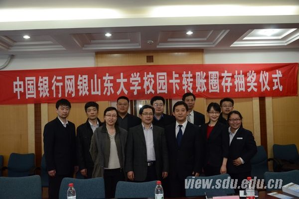 [本站讯]4月17日,由中国银行济南历城支行主办、山东大学网络与信息中心协办的“中国银行网银山东大学校园卡圈存抽奖仪式”在山东大学中心校区举办。参与此次活动的有山东大学网络与信息中心副主任李永在、中国银行济南历城支行行长王建卫、副行长郑民、济南分行电子银行部张兴总经理、审计处苏延明等相关领导。朱艳杰等20名学生代表一同参加了抽奖仪式。