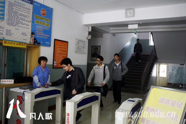 8:00,记者正跟隗阿姨聊天,还没有听到刷卡警报,她突然站起来拦住了两个想进楼的年轻人。待到隗阿姨开口询问我们才意识到这并不是本楼的学生。监督同学们刷卡进入宿舍,防止外来人员进入是隗阿姨的工作之一。隗阿姨说,这个楼上住了700多名学生,她虽不能一一叫出他们的名字,但是差不多都能认全。