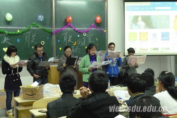 随后会长田蓉简要地介绍了此次活动的意义,宣布联谊会正式开始。首先,田蓉演唱了歌曲《大头儿子小头爸爸》,大家纷纷称赞这个开场秀“很萌很给力”。紧接着,秘书处以十分专业的歌曲演唱充分调动了观众们的欣赏热情。之后,来自新闻编辑部的全体成员们也不甘示弱,他们用各自的方言朗诵情诗,新颖的表演形式让大家眼前一亮,现场气氛达到高潮,尤其在孙凤娇同学深情地朗诵山东话版本的《再别康桥》时,全场爆笑,掌声雷动。宣传部王瑄用流利的英语为大家朗诵《罗密欧与朱丽叶》中的经典对白,博得了台下阵阵喝彩。最后,活动部部长也亲自献唱,歌声优美动听。