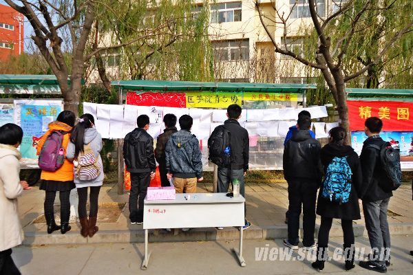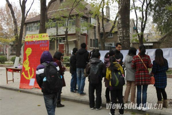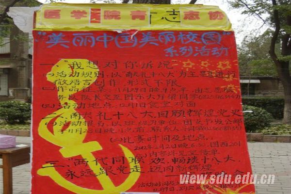 [本站讯]12月1-2日,医学院在趵突泉校区和软件园校区举行了“美丽中国,美丽校园”系列活动之“我想对你诉说”活动。该系列活动旨在响应十八大建设“美丽中国”号召,积极建设美丽校园文化,宣传党的十八大精神,投身志愿服务,创建和谐校园氛围。系列活动第一篇——我想对你诉说,是以“献礼十八大”为主题的微语言创作大赛,鼓励同学们以三行诗,微小说等各种文体形式参与投稿,表达对党和国家的热爱之情。
