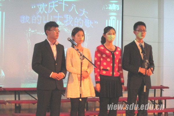 [本站讯]11月25日,经济学院在中心校区举办了“献礼十八大,我的山大我的歌”合唱比赛大三组初赛。参赛的八个班级以动听的和声,精彩的编排,丰富的表演形式吸引了大家的目光,为观众们带了一场精彩纷呈的演出。