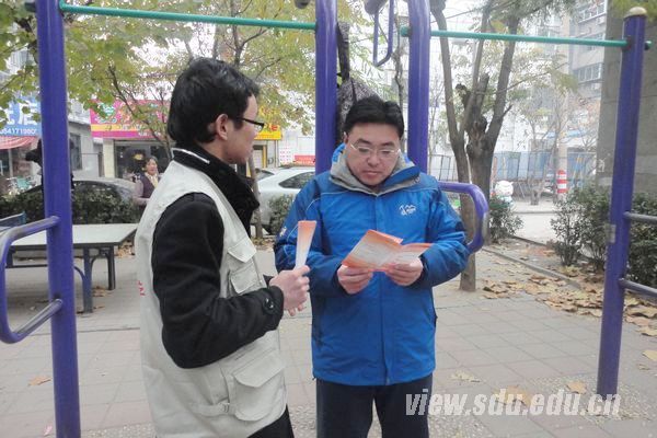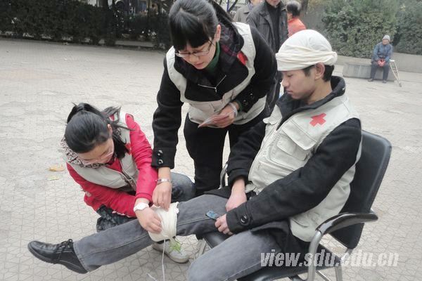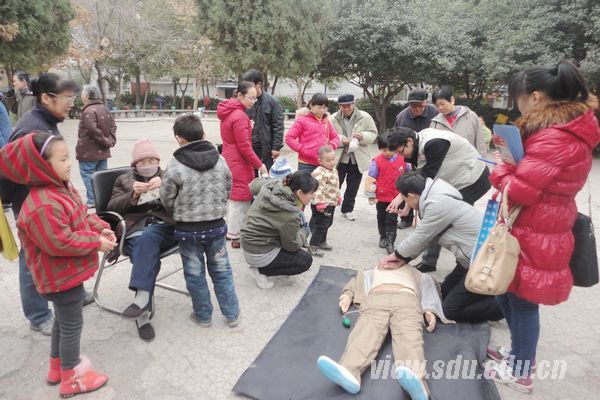 活动开始前,队员们在广场附近向锻炼和游玩的居民们发放了急救知识宣传手册,并为此次活动做宣传。随后,济南市红十字会为此次活动准备的专业模拟假人刚一出现便吸引了众多社区居民的目光。一位阿姨在得知此次活动的目的后,十分热情地上前听讲并说道,学习心肺复苏等急救知识很有必要,终于有机会接触了,一定会认真学习。队员们首先讲解了头部、肩部、膝盖等处的基本包扎方法,副会长雷益寿主动当包扎示范人,并不时对要点进行补充。随着活动的进行,展示区周围聚集了越来越多的市民。在讲解心肺复苏时,队员们先完整地讲解了一遍复苏过程,然后针对市民们提出的疑问进行了解答,会长张友娟还强调及补充了一些要点细节。因为有了更多的新听众,张友娟再次示范了动作过程。讲解结束后,居民们纷纷围上前去,在队员们的指导下进行练习。