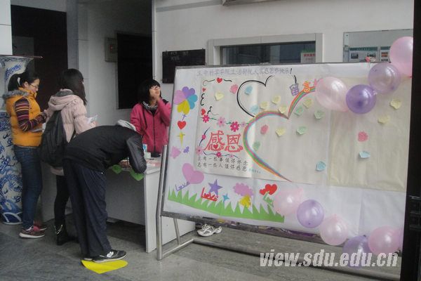 活动在装扮一新的生物北楼大厅举办:高垂的彩色丝带轻轻飘荡,精致的纸蝴蝶和五角星穿梭其间,营造出温馨的气氛;大厅北面是浅紫色的海报,“用最朴素的方式,表达最深的谢意”表现了本次活动的主题;大厅南面摆放着留言板,手绘海报和气球组成一颗美丽的“心”,同学们可以在留言板上写下自己的感悟,传递同学们感恩的心意;留言板旁边展示着“留住感恩,送出关怀”贺卡制作大赛的优秀作品,“创”意盎然。温馨的布置让人耳目一新,而活动的开展形式更是丰富多彩。由生活部的同学向参与活动的同学们提供便笺纸和贺卡,同学们可以在便笺纸上写下感恩与祝福的话语,贴在展板上,表达自己的心意;也可以在贺卡上写下想对亲人、对老师、对朋友说的话。这些装载着满满祝福的贺卡由生活部的同学送至收卡人宿舍或者邮寄出去。通过最朴素的方式,向亲友表达同学们最深切的感恩之情。