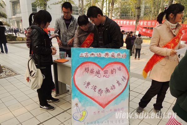 [本站讯]11月21日,化学院青年志愿者协会在中心校区举行“三言两语 典藏感动”感恩节特别活动。活动旨在呼吁大家感恩生活,在这个特殊的日子里向亲朋好友和师长表达自己的感激之情。