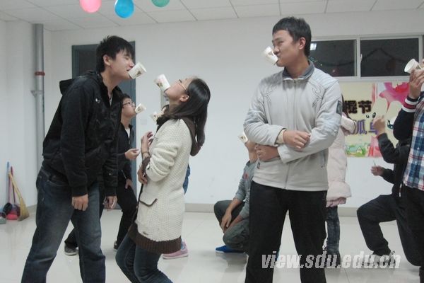 晚会由三个游戏组成。第一个游戏是你画我猜,由主持人任意抽选两名异性同学组成一个小组,在两分钟内进行游戏,猜出词语最多的一组将有机会领取最终的奖品。第二个游戏是纸杯传球,任意抽中的六人组成一组,每一个人咬住一个纸杯,从第一个人开始将纸杯中的乒乓球依次传到最后一个人,用时最短的一组获胜,期间不允许用手等其他部位接触球或纸杯。在每个游戏中又穿插着同学们交换礼物的环节,每个同学都收到了带有祝福的小礼物,有手套,围巾等。除此之外,有情歌对唱《最浪漫的事》,还有宿舍齐唱的《幻听》等,同学们在台下也一起和着,气氛温馨和谐。