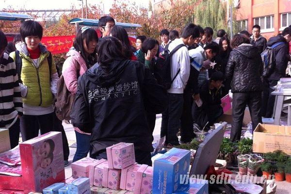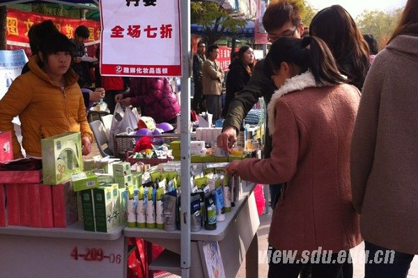 集市上,各种商品玲琅满目,冬季衣服、棉拖棉袜、u盘、手机贴膜、书籍、盆栽、护肤品等商品应有尽有,更有学生摊位亲情加盟。前来购物的学生络绎不绝,集市上一片热闹景象。大多数同学表示,活动的确方便了他们的生活,也让冬季校园多了几分生气。有的同学还提议,希望下一届山大集市可以增加食品销售商家。