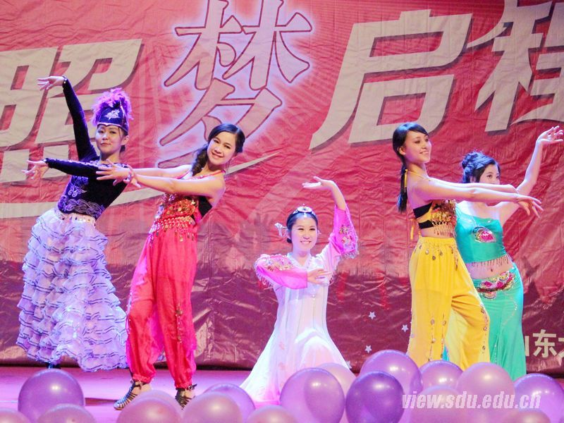 晚会以活力四射的啦啦操表演开场,瞬间点燃了现场气氛。不论是美妙的歌舞表演,还是俏皮的语言节目,都引得现场阵阵欢呼与如潮掌声。晚会伊始,《我的歌声里》与《我的山大我的家》使大家深深沉醉。别出心裁的音乐剧《Someone like You》与尼诺剧社倾情奉献的英文歌舞剧《Nero Show Time》更是给大家带来了视觉与心灵的双重震撼,带领大家融入剧中世界。不同年级学生共同演绎的激情洋溢的街舞《Only One》与不同民族同学一起带来的曼妙柔美的民族舞串烧,体现出山大海纳百川的气魄和外院和谐多元的气氛。此外,诙谐的小品《校园生活之琼瑶style》、神奇的魔术、动人的朗诵,以及由研究生新生带来的情景剧《蜡像馆之夜》都给现场观众带来了快乐与享受。晚会舞台两侧的“微博墙”吸引着同学们的目光。这块大屏幕上不断滚动着观众们通过手机短信及网络发来的祝福、心情以及观看感想,与节目形成了实时互动,增添晚会气氛同时也促进了同学感情。在观众互动环节,团委收集了所有新生的笑脸,作为“幸福脸庞”,随机抽取幸运观众,表达祝福。层出不穷的创意使同学们感到惊喜连连。