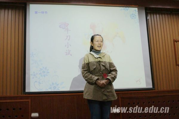 整场比赛由牛刀小试、秀出我风采、想象大比拼和我是大明星四个环节组成。入围决赛的9名选手参加第一、二轮的比拼,随后将产生五名优胜者进入三、四轮的终极对决。在第一轮的“牛刀小试”中,九名选手伴着优美的音乐,用PPT向大家介绍了自己和美丽的家乡。第二轮的“秀出我风采”将整场比赛推向了第一个小高潮,选手们拿出看家本领,动听的歌声,奇妙的魔术,精彩的故事,搞笑的说唱,花样不断,层出不穷。来自临床七年制的周旭日同学刚柔并济的武术表演让观众大饱眼福,她用手中的大刀展示了东方武术的独特魅力。此外,来自生科基地班的赵曦同学带来的现场花艺展示充分激发了观众的好奇心,朵朵含蕾欲放的鲜花与嫩绿的枝叶在她的搭配下极具艺术感,伴随着优美的歌舞展示,给观众们带来了一份雅致恬淡的享受。