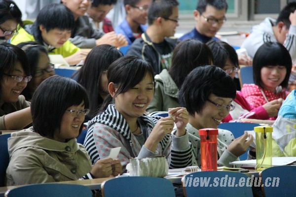 2012级辅导员李进主讲。讲座开始,李进首先提出三个问题:大学是什么?大学可以给你什么?你来大学做什么?同学们就这三个问题展开积极思考与讨论,李进总结学生发言,说明大学是一段浪漫的人生,是进入社会的门槛,也是一次考验。她结合学校的人格培育工程,历数了几种典型的大学生现象,提出“大学第一年应该怎样度过”的问题,进一步引起同学们的思考。讲座中,李进向同学们讲述了自己的大学经历,鼓励同学们在新的环境中要树立信心。李进还与同学一同做了撕纸游戏,在游戏互动中,同学们更加认识到人生的短暂,表示要珍惜时间,及早奋斗。随后,李进放映了由她本人参与制作的山东大学2012届毕业生专题影片《流年》,希望大家能以新生的眼光看待毕业生对大学生活的所思与所感。影片精彩深刻,使在场同学深受感染。最后,李进就大学适应问题提供了很多建议,告诫同学们要学会生活、学会学习、学会交往、学会做人,并分别从学习、职业、生活三方面进行了详细的讲解与指导,鼓励大家从大一起就要做好职业生涯规划。