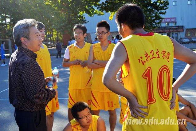 伴随开始哨声响起,现场气氛快速攀升,双方很快进入了激烈角逐。公卫学院众多2012级研究生自发来到千佛山校区篮球场,给男篮队员们助威。上半场,公卫学院4号队员2011级刘涛利用对方犯规罚球得分,拔得头筹。晶体研究所男篮也快速反击,展开对轰,双方比分交替上升。上半场结束,比分9:10,公卫男篮以一分之差落后。下半场,晶体研究所男篮凭借身高优势和严密的防守,逐渐把分差拉大,但公卫男篮也不甘示弱,奋起直追。公卫学院党委副书记李士保坐镇现场指挥,适时叫停并进行战术部署,公卫男篮状态迅速回升,双方拼抢异常激烈。比赛最后,面对仍然落后的局面,公卫男篮不言放弃,但最终也没能扳回比分,以17:29的比分不敌劲旅晶体研究所男篮。