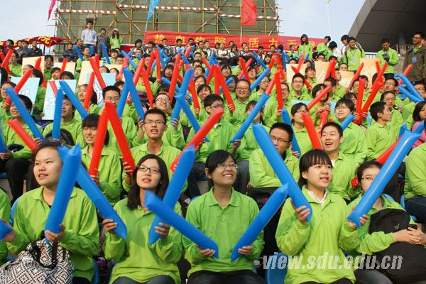 坐在观众席上的生命学院同学,在气势磅礴的鼓声中,挥动手中的充气棒,高声喊出 “激情生院,再创辉煌” 的口号,彰显了生命学院的团结与信心。