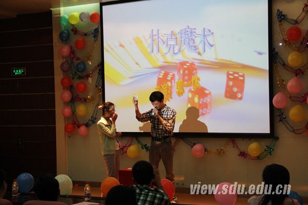 互动环节的托运游戏,调动了在场师生的情绪,幸运小王子和美女天使们用嘴巴叼着吸管传递皮套让大家捧腹不已,整个现场笼罩在热烈欢快的氛围中。接下来,小提琴伴奏的诗朗诵《我们》、歌伴舞《爱的华尔兹》和吉他弹唱《旅行的意义》更是展示了电气学院2012级研究生的风采。最后,研究生会为大家献上了别出心裁的舞台剧《阿焦的一天之我的山大我的家》。晚会在全体演员合唱的《相亲相爱》中落下帷幕,研究生办公室老师宋济平也参加晚会。