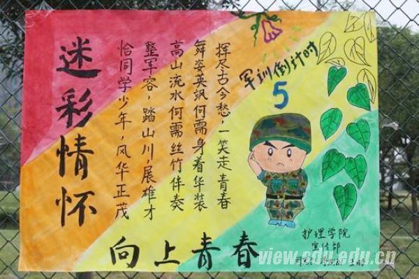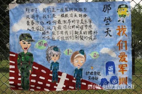 在军训场上,除了英姿飒爽、刻苦训练的方阵队员们和认真指导的教官们,训练场地四周张贴的海报也同样引人注目。护理学院宣传部2012级的干事们利用军训的闲暇时间,以军训生活、向上青春为主题,绘出了色彩绚丽、鼓舞人心的海报,给训练场添了一抹亮色,也让同学们有了一个更为放松的场地。同时,护理学院联合药学院举办了“军训感言”征文比赛,每天挑选优秀稿件粘贴在展板上。这一活动极大鼓励了学生的写稿积极性,丰富了学生军训期间的生活。