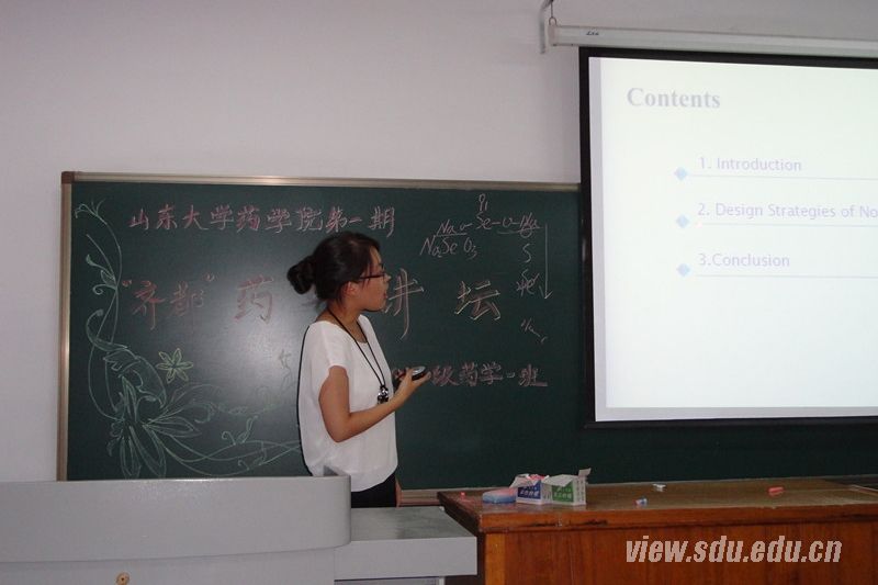 邵伟在致辞中对“齐都”讲坛提出了要求:一是要讲自己的东西,要有自己的独特见解;二要符合自己的兴趣,兴趣是最好的老师,兴趣的建立对以后读研、工作都有很大帮助。第一个上台的于炳辰同学以《可德兰多糖硒化衍生物的制备及其活性研究》为题,从研究背景、实验设计思路、研究方法和实验心得等方面进行了演讲。随后登台的张烁同学的演讲题目是《新型抗耐药性非核苷类HIV-1型逆转录酶抑制剂的设计策略》,她的演讲配以全英文PPT演示,让在场观众眼睛为之一亮。最后上台的是赖亮杰同学,他以《浅谈药学生毕业去向》为题,从就业、考研、出国这三个大方面谈论了药学院学生的毕业去向,使在场同学对自己毕业后的去向有了更好更全面的了解。