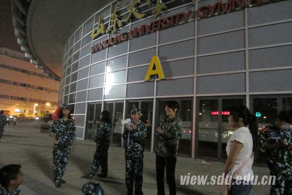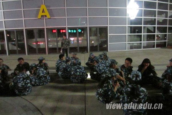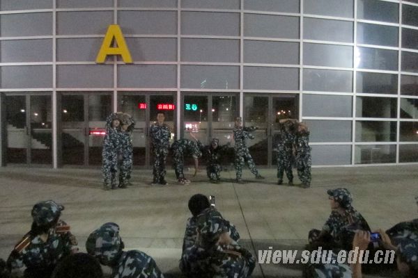 晚上七点半,为增进新生们彼此间的了解和感情,活跃军训学员们军训期间紧张的气氛,环境学院辅导员曹晓习亲自带领军体拳方队的学员们来到体育馆A号口门前的空地上,玩起了团队小游戏。微笑游戏中,成员们找自己不认识的人相互了解,辅导员表扬了认识人最多的学员。随后的活动更加有趣,“马兰花开,开几瓣”,一声令下,成员们拉起手来,聚到一起,同时也分成了七个组别。根据第二个游戏的分组,学员们要为自己组讨论出队名、队形、口号、队标,并在十分钟后向其他学员们展示自己的团队。紧张的讨论开始了,队员们各抒己见,为自己的团队献计献力。千手葫芦娃队、豆豆帮,千奇百怪而又充满创意的队名和队形被新生学员们展示了出来。最后的活动是互写感言,由小组内其他队员抽取并念给大家听,从他们的感想中可以感受到,他们收获的不只是欢笑。