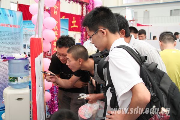 为了通过迎新工作的这个平台加强对新生的教育和引导,本次迎新学院确定了“向上青春”的主题,通过整个迎新现场的精心布置突显主题,彰显学院专业特色:现场报到入口处“今日金秋送爽喜迎机械八方学子,来时只争朝夕共就祖国四海栋梁”的对联醒目喜庆,增强了新生的归属感;入口通道两旁十张主题海报都注重以第一人称“我们”从学生的角度展示了学院的概况和特点,通过海报的介绍,新同学能够基本全面清楚地了解大学四年可以利用的资源、可以请教的名师、可以学习的榜样、可以规划的路径、可以提升的平台和可以达成的梦想;现场展示了部分高年级同学科技创新的代表性作品,并通过电视视频播放艾兴院士讲话、学院宣传片、学生活动片段和山大校歌以及青春励志歌曲,直观动态地表达了“向上青春”的主题;报到出口通道巨幅的背景海报上书写了“情系山大 智造中国”和“机械工程学院热烈欢迎新同学 让我们共铸制造强国的梦想”的文字,并且印上了的具有代表性的机械专业行业产品图像和学院毕业生重点就业单位的标志LOGO,更是给新生们留下了鲜明的印象;报到出口处学院设置了留言海报,新生们可以写下激励他们青春向上的梦想,画出创意LOGO,不少新生都用简练的话语和简洁的图画表达了自己向上青春的心声和形象。高年级的优秀学生是新生们可以直接接触和最易仿效的榜样,学院重点挑选了以学生党员骨干为主体的学生迎新工作队伍,并且提前进行了综合培训,不仅要求他们热情周到、礼貌周全,更要求他们一言一行都要展现青春向上的积极姿态,给师弟师妹们树立良好的身边模范,佩戴统一标志的学生迎新工作人员的优异表现也获得了新生和新生家长们的交口称赞。
