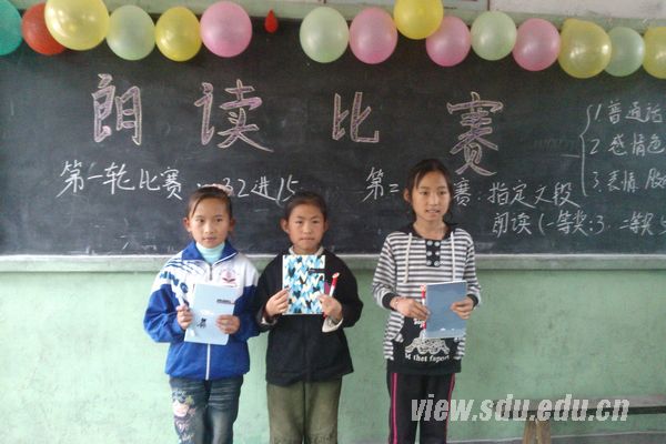 此次朗诵比赛共有34名学生报名参加,分初赛和复赛两场。在第一轮初赛中,选手们根据自己的特长选取适合自己的语段进行朗诵。虽然学生们的普通话还很生疏,但感情非常丰富,或激情洋溢,或温柔婉转,或深情感人,充分展示了他们的朗读才能,赢得了观众和评委们的阵阵掌声。其中陈智学和李昆同学共同朗诵的《别挤啦!》感情充沛、激情四射,更是赢得了评委的一致好评。初赛结束后,经过十分钟的休息,进入复赛的15组选手开始接受新一轮的考验。首先每位选手进行抽签,按照抽取的编码朗诵指定文段。复赛竞争状况更加激烈,为了赢得评委的更多青睐,选手们煞费苦心,在短短几分钟内排练动作、增加面部表情,使朗诵更加生动有趣。《爱我中华》、《大地的话》、《长江之歌》等诗歌被选手精彩地演绎出来,评委老师都向他们竖起了大拇指。最终,经过评委的讨论,何彤、梁慧慧、王静三名同学获得一等奖,支教队员为他们颁发了奖品并合影留念。至此,朗诵比赛圆满结束。“化翼”支教队员与孩子们度过了一个充实有意义的下午。