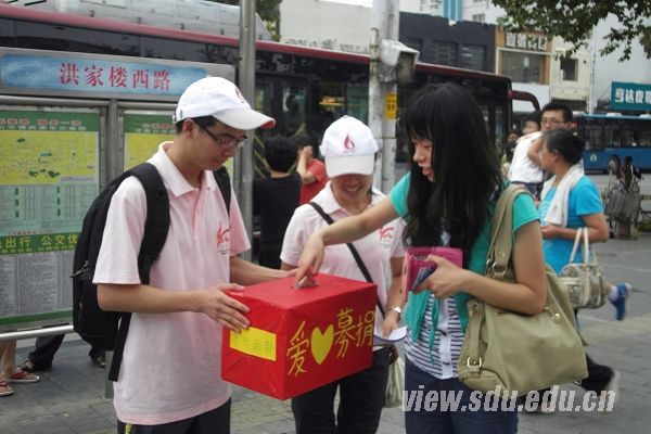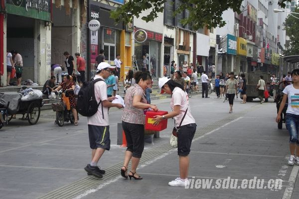 下午,队员们在济南市芙蓉街、洪楼大润发展开劝募活动。一部分队员手拿募捐箱,一部分同学拿着宣传稿向来往路人介绍爱心活动,另一部分人从旁拍照录视频。一开始活动进行得并不顺利,虽然芙蓉街人潮众多,但是来往人群多为匆忙购物的,队员们搭上了海报,但是宣传效果并不明显,在芙蓉街仅仅募到了一元钱。队员们有些灰心丧气,随后队长及时调整战略,转战洪楼银座和大润发。到达大润发后,队员们打起精神,面带微笑,继续向来往的路人宣传。可喜的是,很多人留意到“书行西部”的活动,停下匆忙的脚步,更有热心的民众自发的向队员们问询活动情况,因此,团队在洪楼收获很多。虽然也有很多人漠视而过或是故意避开,但是队员们相互鼓励,一起克服实践中的困难。